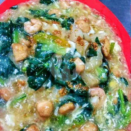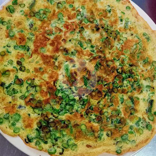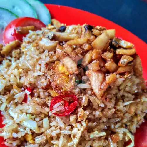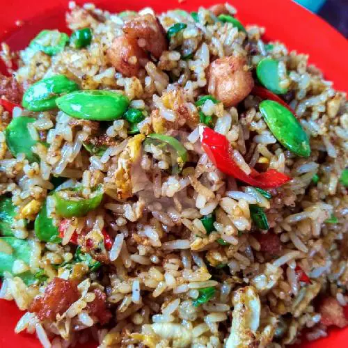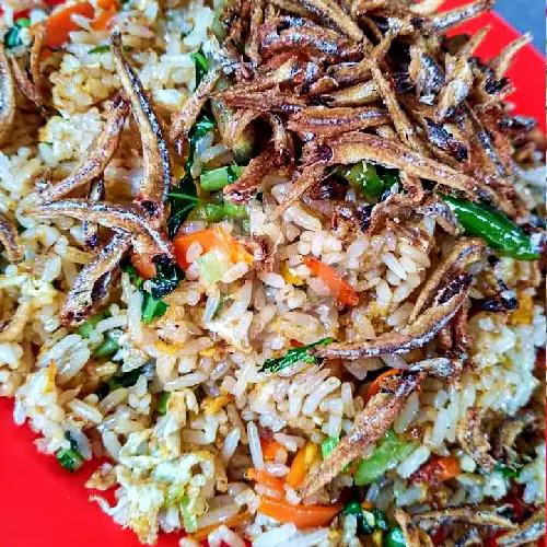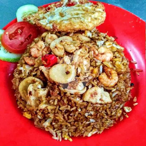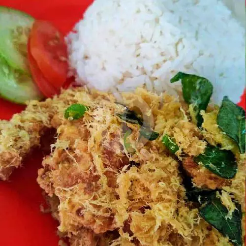 Nasi + lauk dengan taburan kremes kuning telur, pilihan lauk dori / udang / cumi / ayam