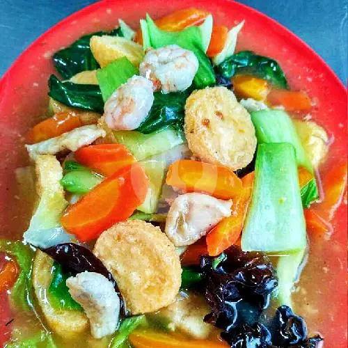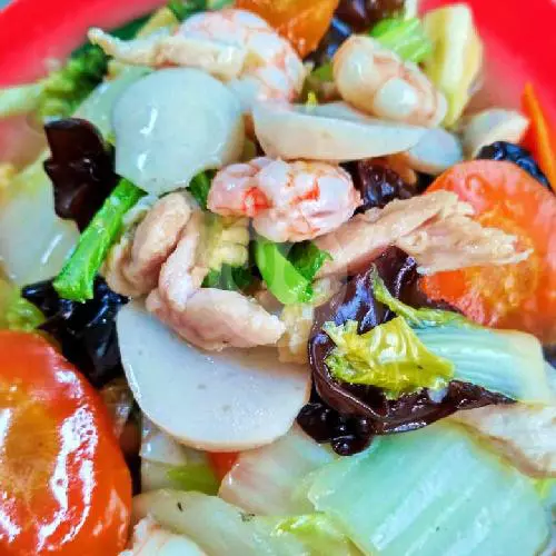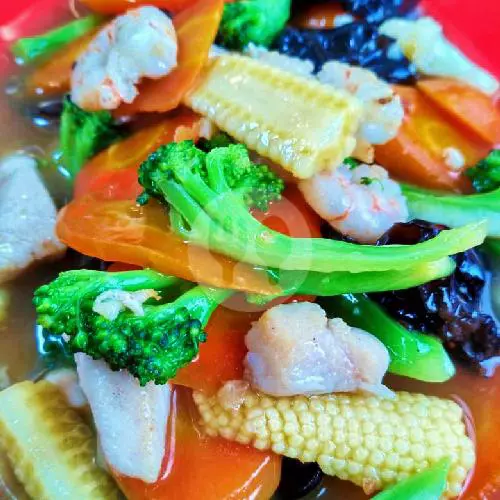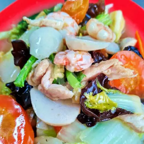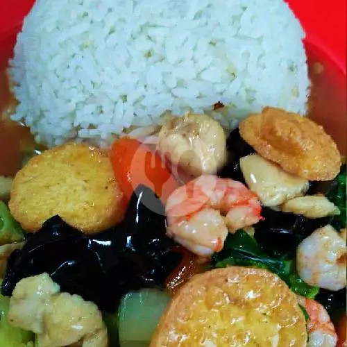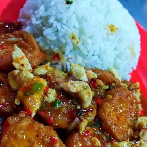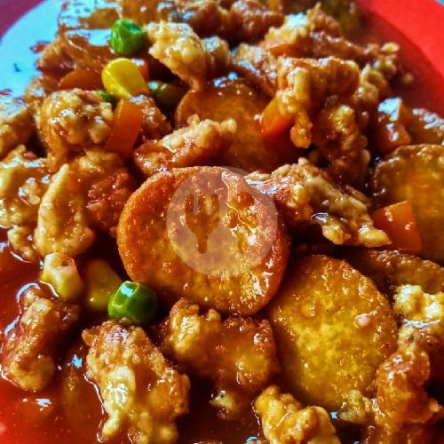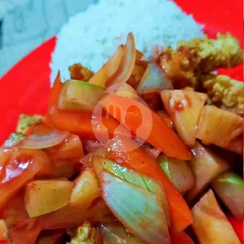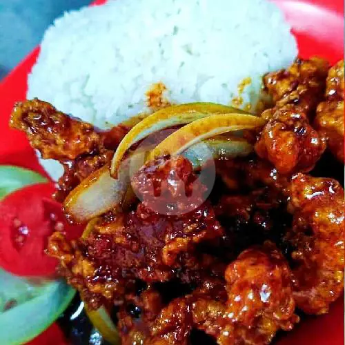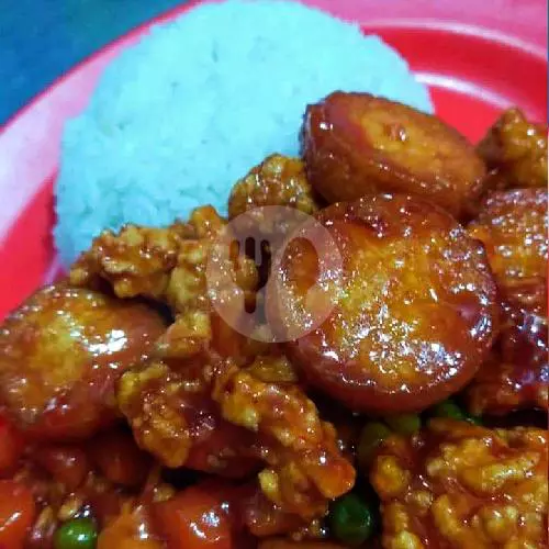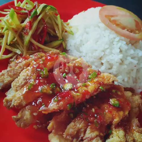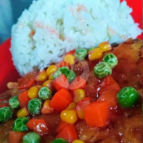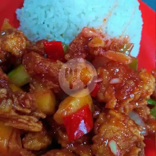 Nasi + lauk dengan saos asam manis, pilihan antara dori / udang / cumi / ayam