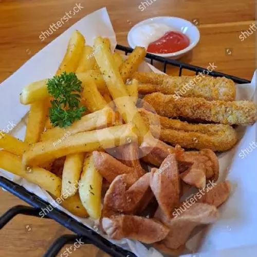 Nasi, telor, sosis, bakso, sayuran tambah Kerupuk