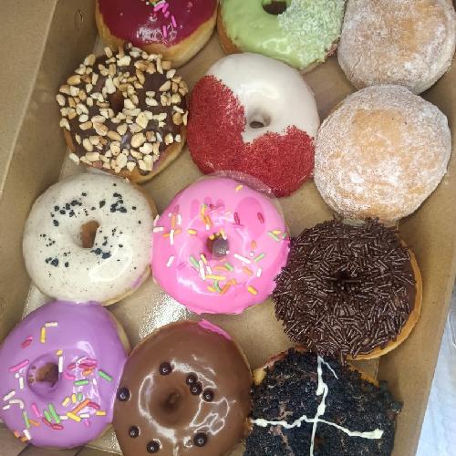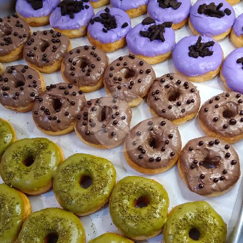 Donat manis dengan berbagai topping warna-warni dan gula yang lezat.