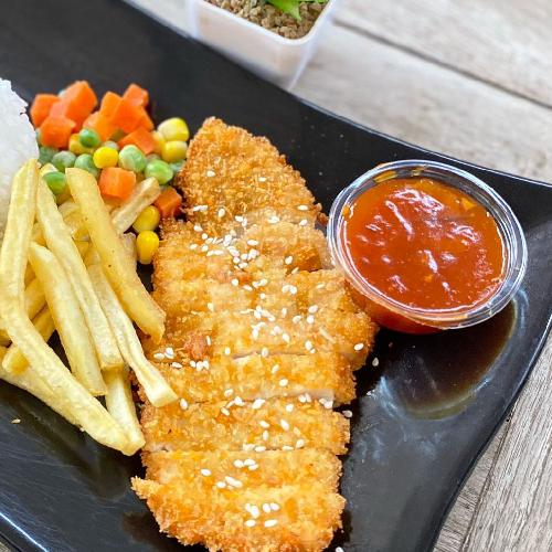 Ayam Katsu, Kentang Goreng, Sayur Mix, Saus