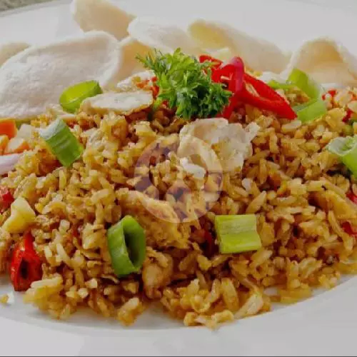 Nasi Goreng, telur Dadar ,bakso, ayam Cincang ,krupuk, daun Bawang, Wortel, timun