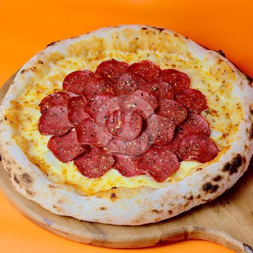 Saus bolognese, mozarella, bawang Bombay, Pepperoni, oregano,Basil,Lada hitam.
