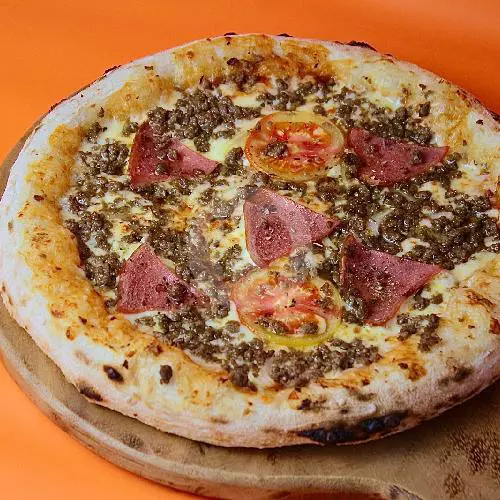 Saus Bolognese, Mozarella, Smoked Beef, Daging Giling, Bawang Bombay, Tomat Iris, Oregano, Basil, Pada Hitam