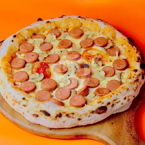Saus bolognese, mozarella, bawang bombay, sozis sapi original, jamur, basil, oregano, lada hitam, tomat iris