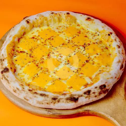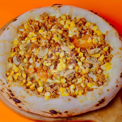 Saus Putih Premium, Mozarella, Bawang Bombay, Ayam Saus Barbeque, Jagung, Jamur, Tomat Iris, parsley, Lada Hitam.