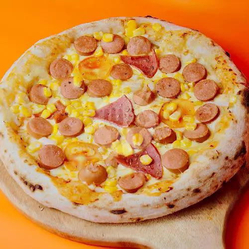 Saus bolognese, mozarella, smoked beef, sozis sapi original, jagung, bawang bombay, tomat iris, oregano,basil,lada hitam.