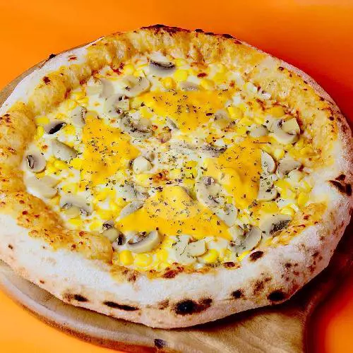 Saus Putih Premium, Mozarella, Bawang Bombay, Ayam Saus Barbeque, Jagung, Jamur, Tomat Iris, parsley, Lada Hitam