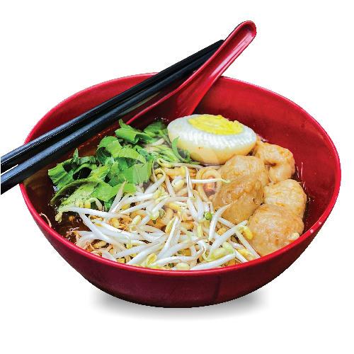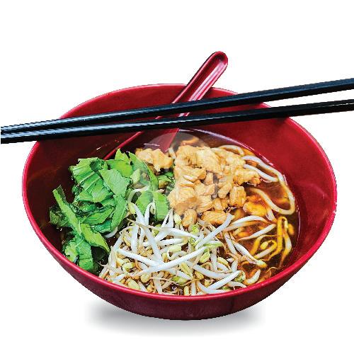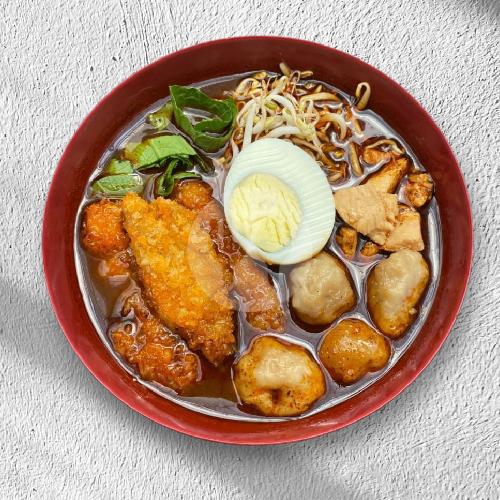 Ramen dengan topping ayam teriyaki, ayam katsu, dan bakso