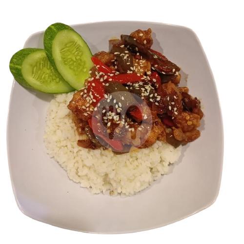 Bento dengan ayam teriyaki, salad, saus, dan chicken bubble crumb