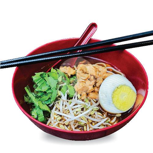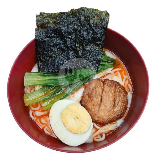 Ramen dengan kuah susu serta topping ayam catsu, telur, dan nori