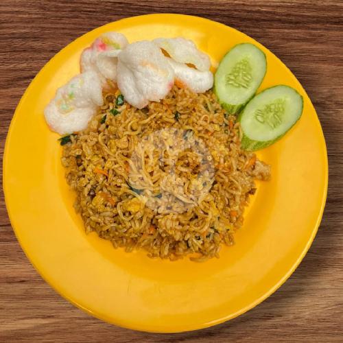 Nasi goreng yang dicampur dengan mie dan topping telur