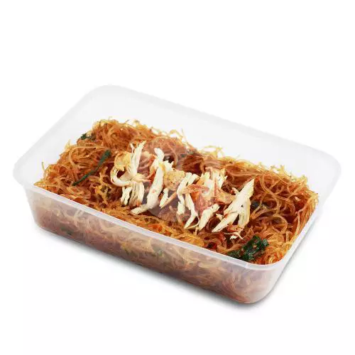 Bihun goreng frozen yang disajikan dengan toping ayam suwir dan taburan bawang goreng dengan cita rasa yang manis dan gurih.