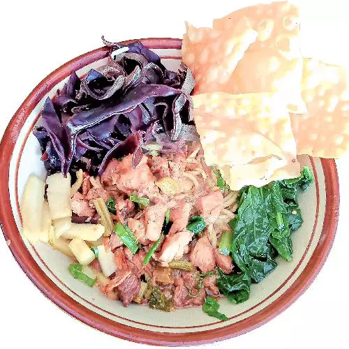 Mie dengan toping ayam, acar timun dan kripik pangsit