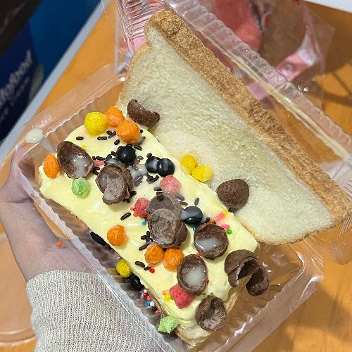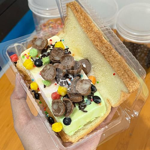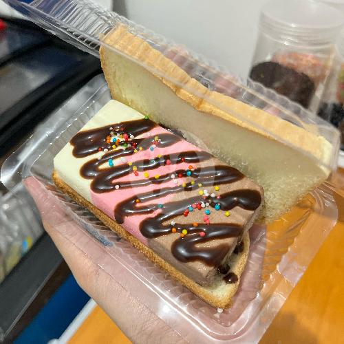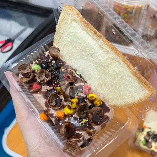 Ice potong 3 rasa dengan isian roti, dan topping snack coco crunch, nyam nyam, sprinkle, meses, coco chips, susu coklat